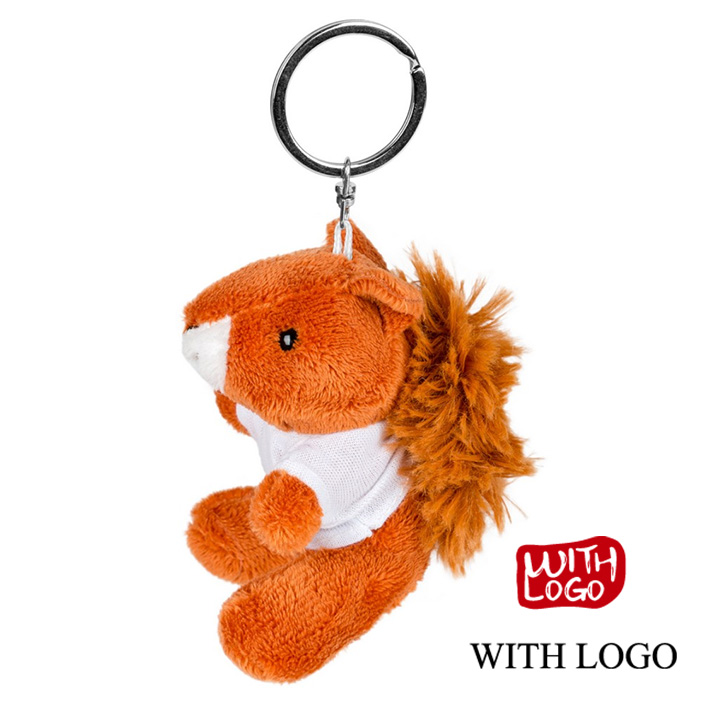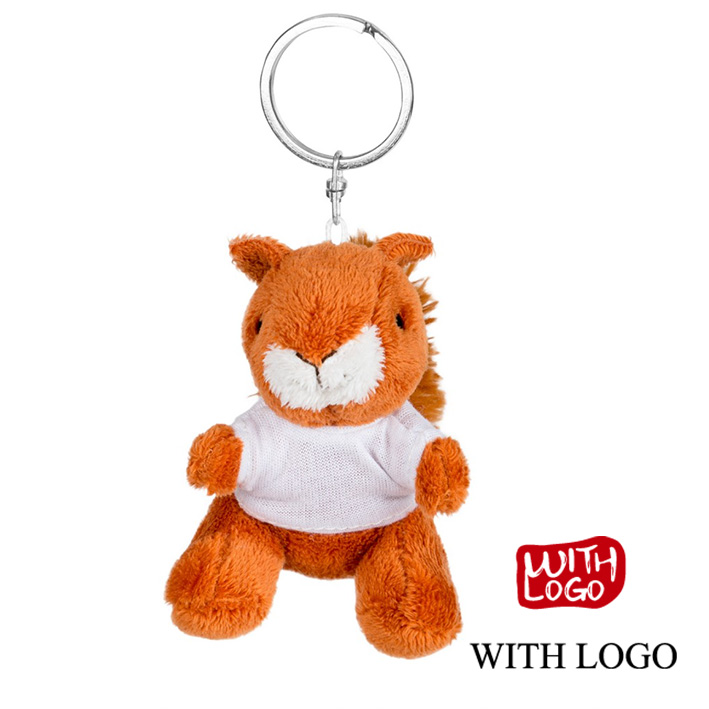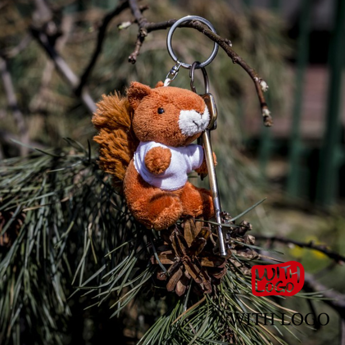 Llavero de ardilla de peluche con camiseta blanca personalizable mediante transfer térmico. Ideal para merchandising. MOQ 50 unidades.