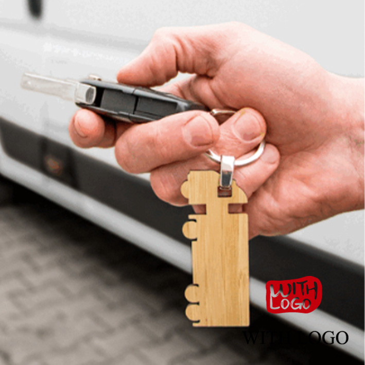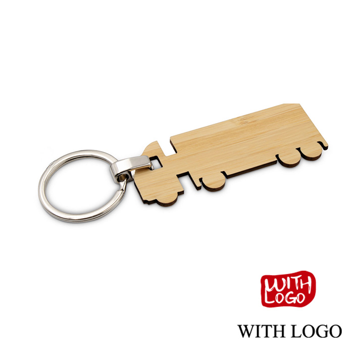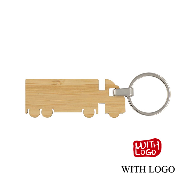 Llavero ecológico de bambú con diseño de camión y grabado láser personalizado. Ideal para empresas de transporte y regalos promocionales.